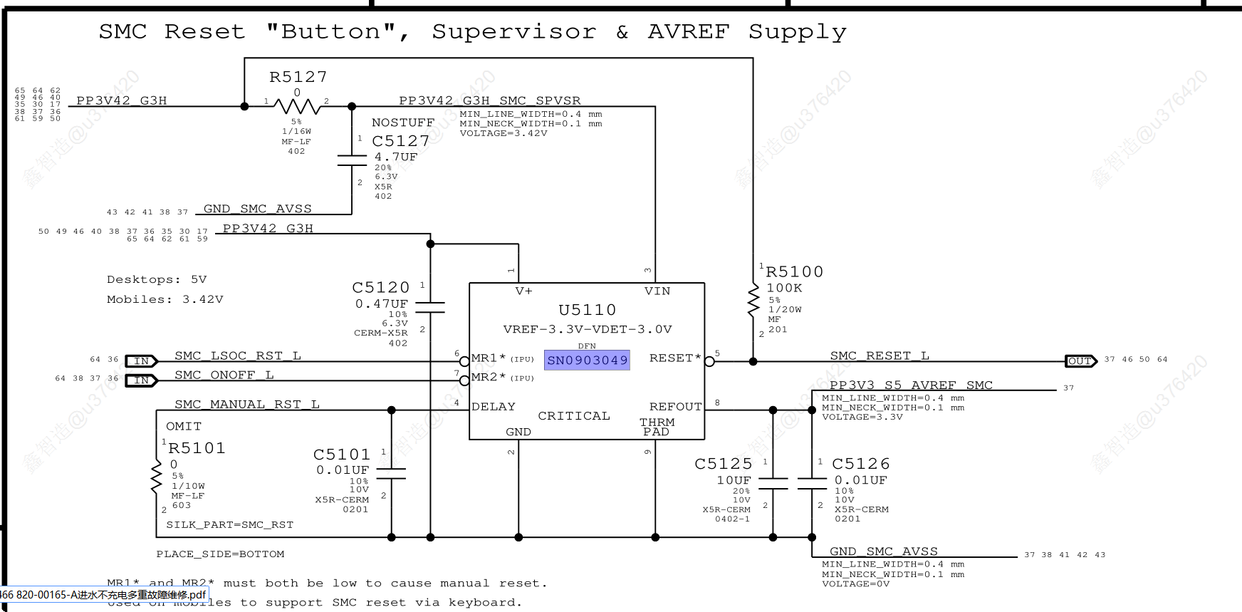 一、核心芯片与功能定位 U5110(电压监控器/复位控制器) 型号为 VREF-3.3V-VDET-3.0V,具备以下功能: 电压监控:监测输入电压(VIN),当电压低于阈值(3.0V)时触发复位。 复位逻辑处理:接收外部复位信号(低电平有效),输出全局复位信号(RESET*)。 参考电压输出:REFOUT引脚(8脚)可提供稳定的参考电压(图中未外接负载,可能备用)。 二、电源输入与滤波 1. 主电源输入(V+) 输入源:通过 PP3V42_G3H(3.42V,桌面版)或系统其他电源(移动版3.42V)接入。 滤波与限流: R5127(1/16W,5%):限流电阻(若NOSTUFF未焊接则不接入),保护芯片。 C5127(4.7μF,6.3V X5R):电源滤波电容,滤除高频噪声,稳定V+电压。 2. 参考电压输入(VIN) 基准电压:通过 R1510(100kΩ,1/20W) 上拉至 AVREF_3V3(3.3V参考电压),为U5110提供电压检测基准。 滤波:C5120(0.47μF,10V X5R) 滤除AVREF_3V3的纹波,确保VIN稳定。 三、复位信号输入与逻辑 1. 外部复位输入(低电平有效) 输入信号(引脚1/2/4): SMC_LSOC_RST_L:系统低功耗复位信号。 SMC_ONOFF_L:电源开关复位信号。 SMC_MANUAL_RST_L:手动复位信号。 滤波处理: C5101(0.01μF) 与 R5101(OMIT,可选) 组成RC滤波,抑制输入噪声,避免误触发。 2. 手动复位逻辑(MR1*/MR2*) 触发条件:注释明确 “MR1* and MR2* must both be low”,即两个手动复位输入需同时为低电平,才能激活内部手动复位功能,增强抗干扰性。 信号连接:MR1*(引脚1)和MR2*(引脚2)直接接入外部手动复位信号,确保复位操作的可靠性。 四、复位信号输出与稳定 1. 复位信号生成 触发条件: 输入信号(LSOC_RST_L/ONOFF_L/MANUAL_RST_L)任一低电平。 电源电压(VIN)低于检测阈值(3.0V)。 输出特性:RESET*(引脚6) 为低电平有效信号,直接控制下游电路复位。 2. 输出滤波 C5125(10μF,25V X5R-CERM):大容量电容,抑制输出信号的电压波动,确保复位信号上升/下降沿平滑。 C5126(0.01μF,10V X5R-CERM):高频滤波电容,消除高频噪声,避免误触发下游电路。 3. 负载驱动 输出信号 PP3V3_S5_AVREF_SMC 连接至系统其他模块(如SMC控制器),通过阻抗匹配的PCB走线(MIN_LINE_WIDTH=0.4mm)确保信号完整性。 五、关键元件参数设计逻辑 元件 参数 作用 R5127 1/16W, 5% 限流保护(NOSTUFF未焊时断开),匹配不同电源版本(桌面版/移动版)的电流需求。 C5127 4.7μF, 6.3V 电源去耦,滤除低频纹波,确保U5110供电稳定。 C5120 0.47μF, 10V 滤波AVREF_3V3,保证电压检测基准精度。 R1510 100kΩ, 1/20W 上拉VIN至AVREF_3V3,提供稳定的电压检测参考。 U5110 VREF-3.3V 集成电压监控与复位控制,支持多源复位触发,提升系统可靠性。 六、整体工作流程 正常工作状态: VIN(AVREF_3V3经R1510上拉)高于3.0V,U5110不触发复位,RESET*保持高电平。 外部复位信号(LSOC_RST_L/ONOFF_L/MANUAL_RST_L)均为高电平,MR1*/MR2*不同时为低,无手动复位。 复位触发场景: 电源欠压:VIN降至3.0V以下,U5110内部比较器翻转,输出RESET*低电平。 外部复位:任一外部复位信号(LSOC_RST_L/ONOFF_L/MANUAL_RST_L)拉低,直接激活复位。 手动复位:MR1和MR2同时拉低,触发独立手动复位功能。 复位释放: 故障排除后,输入信号恢复高电平,VIN回升至3.0V以上,C5125/C5126滤波后,RESET*由低转高,系统复位结束。 七、设计注意事项 PCB布局:GND_SMC_AVSS需就近连接至系统地平面,减少噪声耦合;AVREF_3V3走线需独立,避免与其他电源干扰。 元件替代:NOSTUFF标记的R5127若删除,需确认电源版本匹配(仅适用于3.42V输入);C5120/C5127需选用X5R/NP0等低ESR电容,确保滤波效果。 兼容性:支持桌面版(5V输入)和移动版(3.42V输入),通过电源版本自适应不同设备需求。 该电路通过多级滤波、多源复位触发和阈值电压监控,实现了系统复位的可靠性和鲁棒性,广泛应用于需要稳定电源管理的嵌入式系统